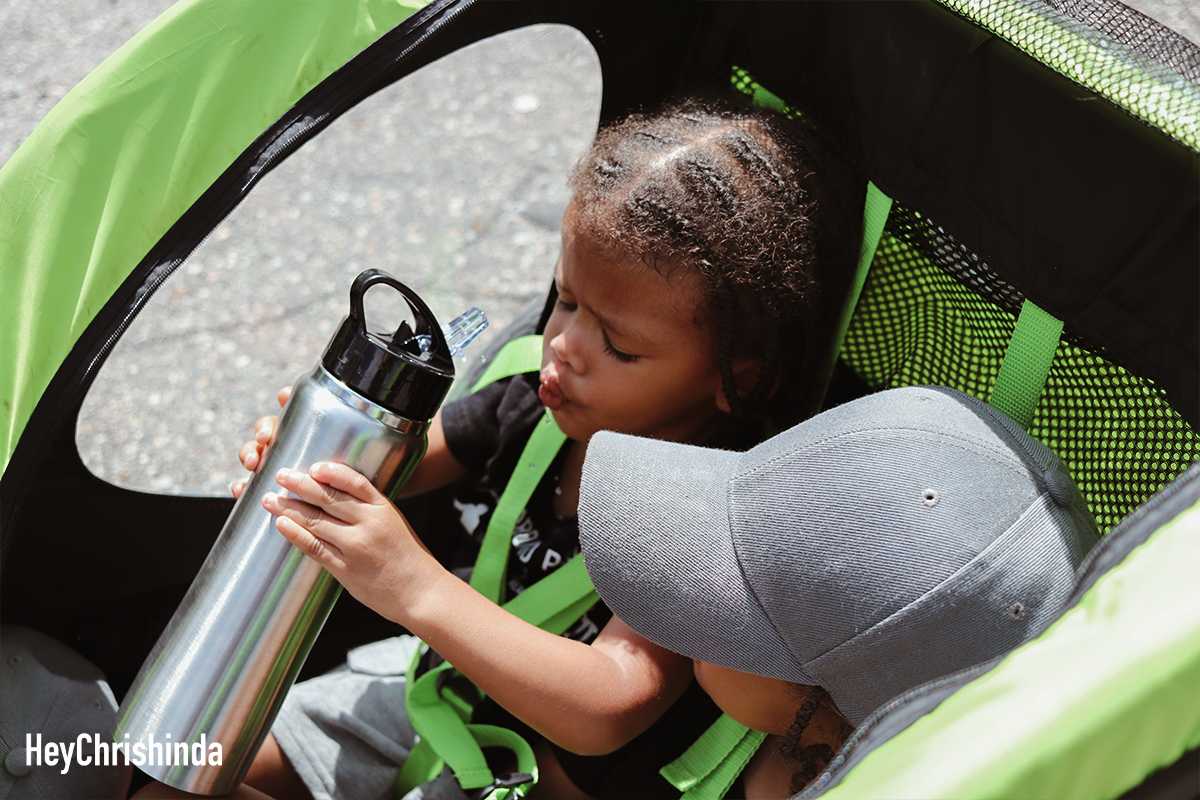–Water, of course. We were taking their own 360 degree cups, but they get warm way too fast, so I got a 24 oz insulated cup from Marshalls for $8. It came with a straw, but my youngest child is a back washer, so I took the straw out…so we can pour the water in our mouths or use the spout.  All 4 of us just share 1 water bottle…we’ll probably end up getting another one. They are always thirsty.  Update: We got the boys their own 14oz stainless steel water bottles with straws and they are great. 24 ounces just isn’t enough for 4 people on a bike ride, lol.