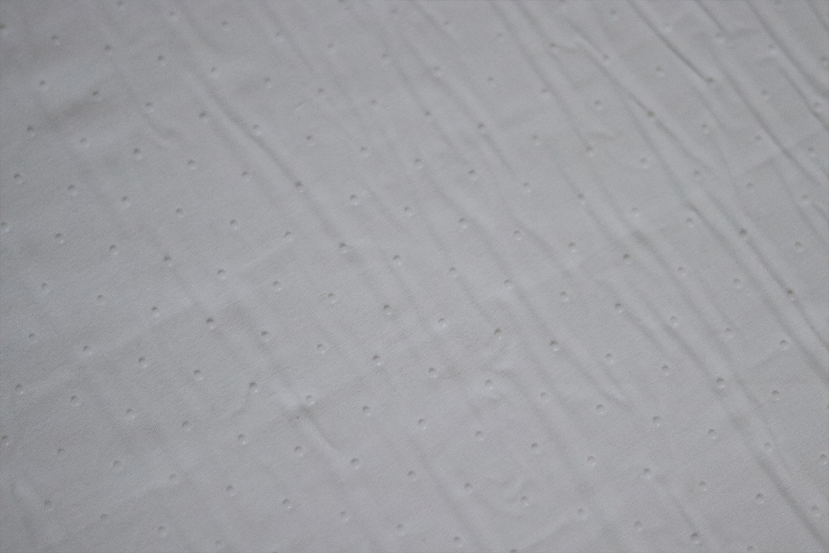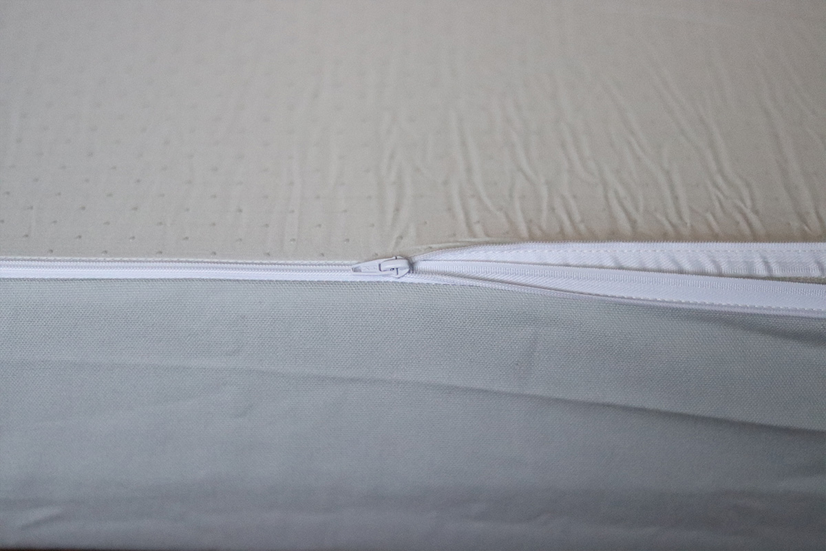 It comes encased in a washable, waterproof cover with a zipper. One side has little balls that are supposed to stop the mattress from sliding around on the floor. You ever get those fuzzy socks that have the little grips on the bottom? That’s what I’m talking about, except smaller.