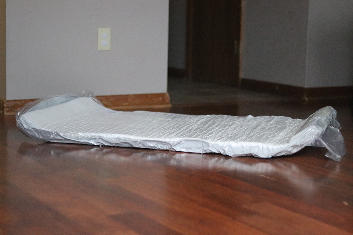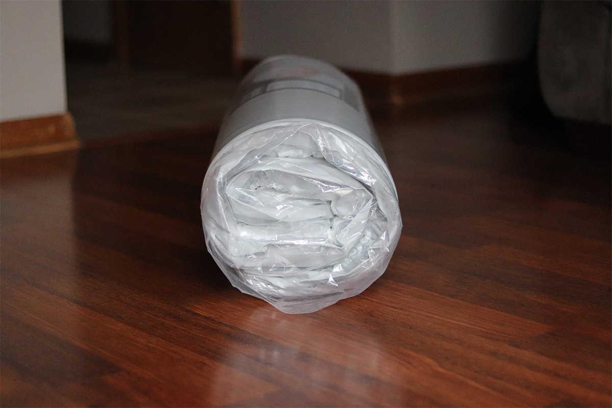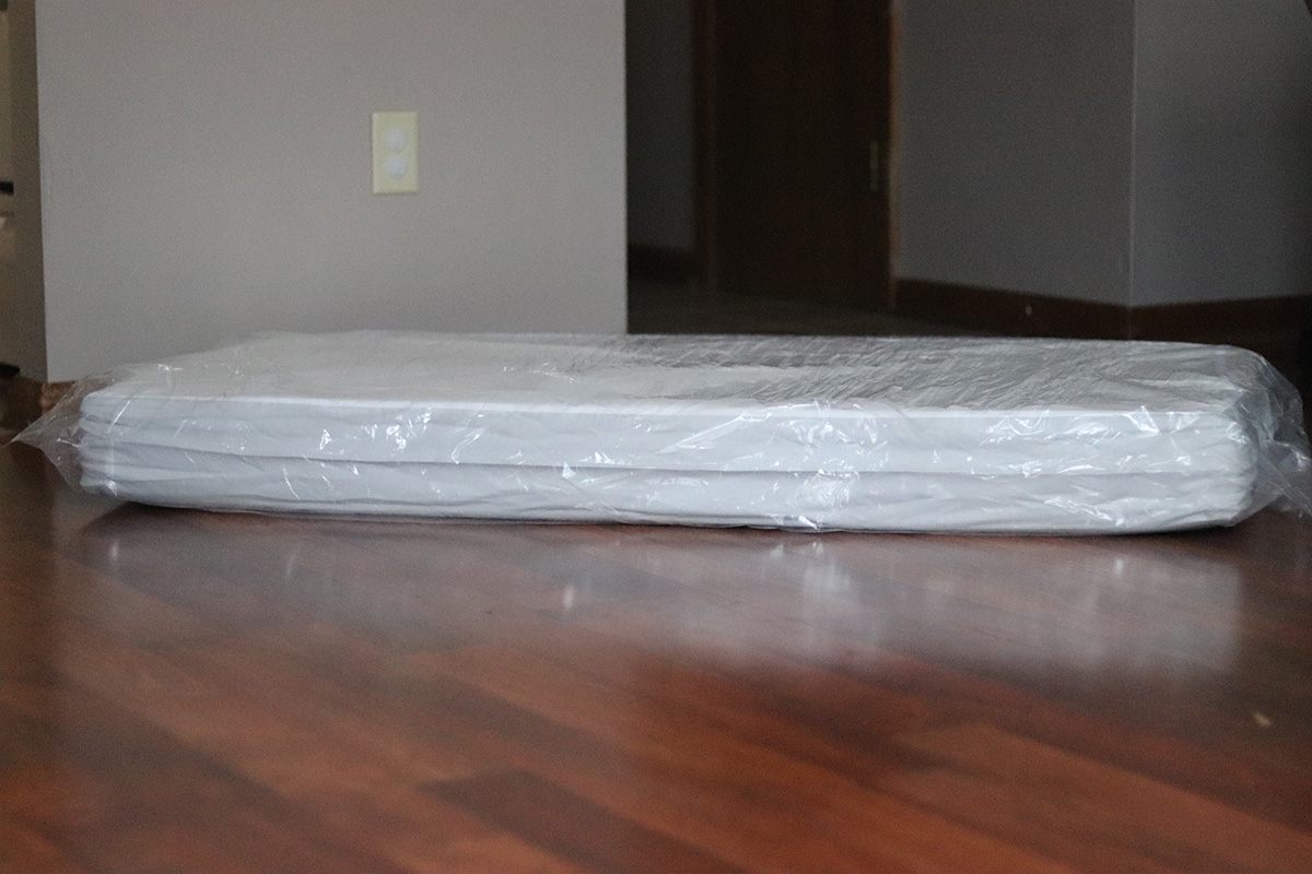 It came in a rectangular box, all rolled up. This mattress’ dimensions state that it fits in standard sized cribs and toddler beds. Measures: 52 x 27½ x 5.5 inches. The dimensions didn’t matter to us since it was going on the floor.