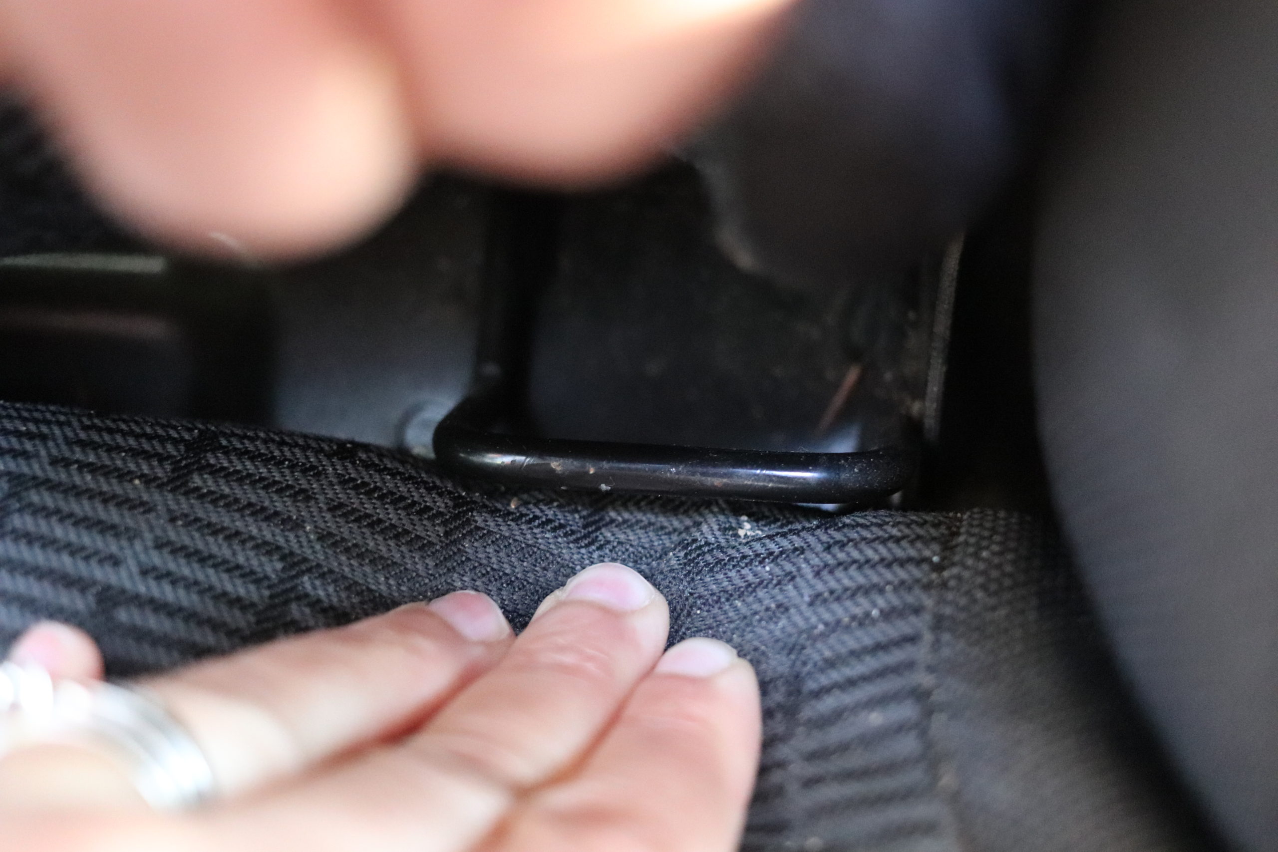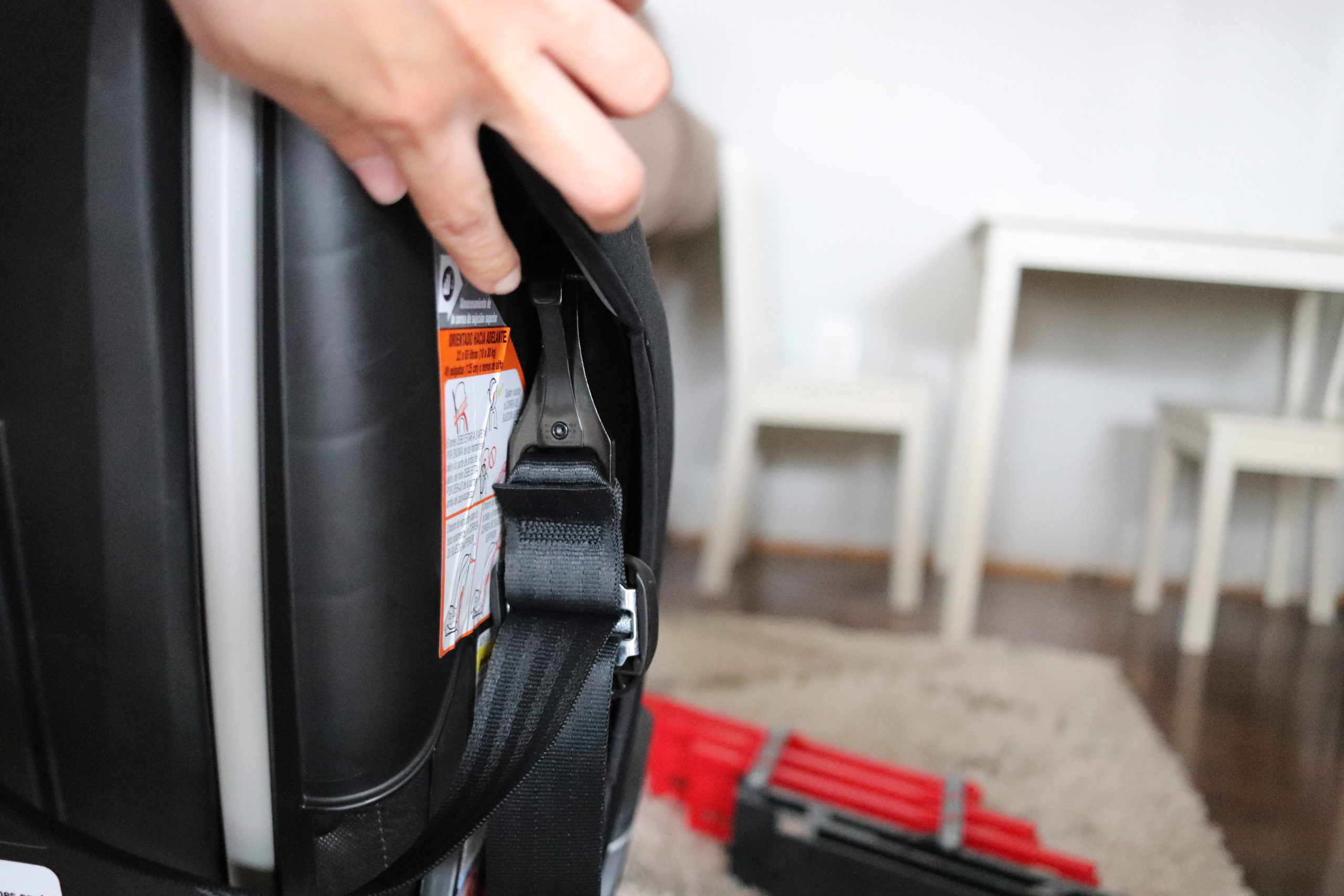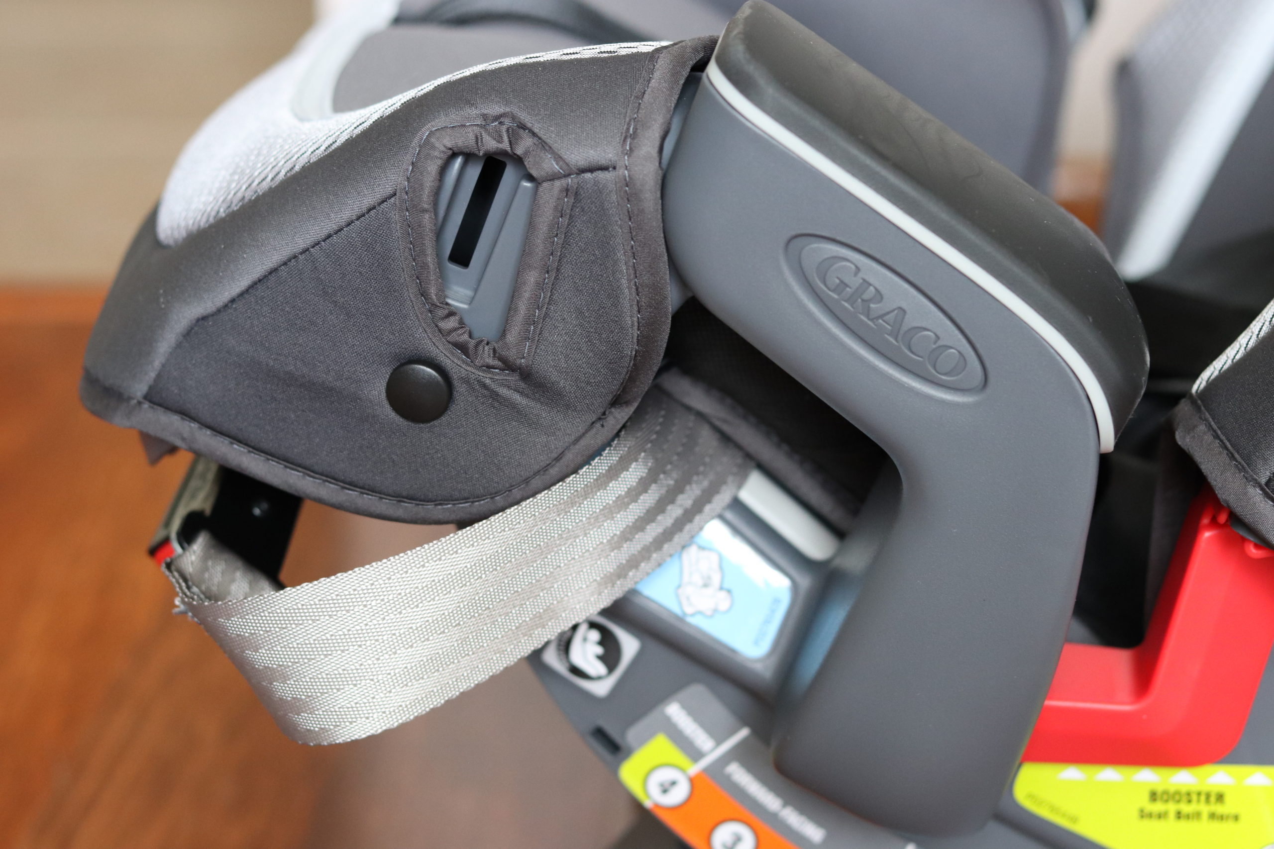 In order to adjust the height of the back of the car seat, you put your fingers under the red button lever, with the rest of your hand on top op the car seat, and pull up at the same time… or push down if it’s too high. This is very easy to do.