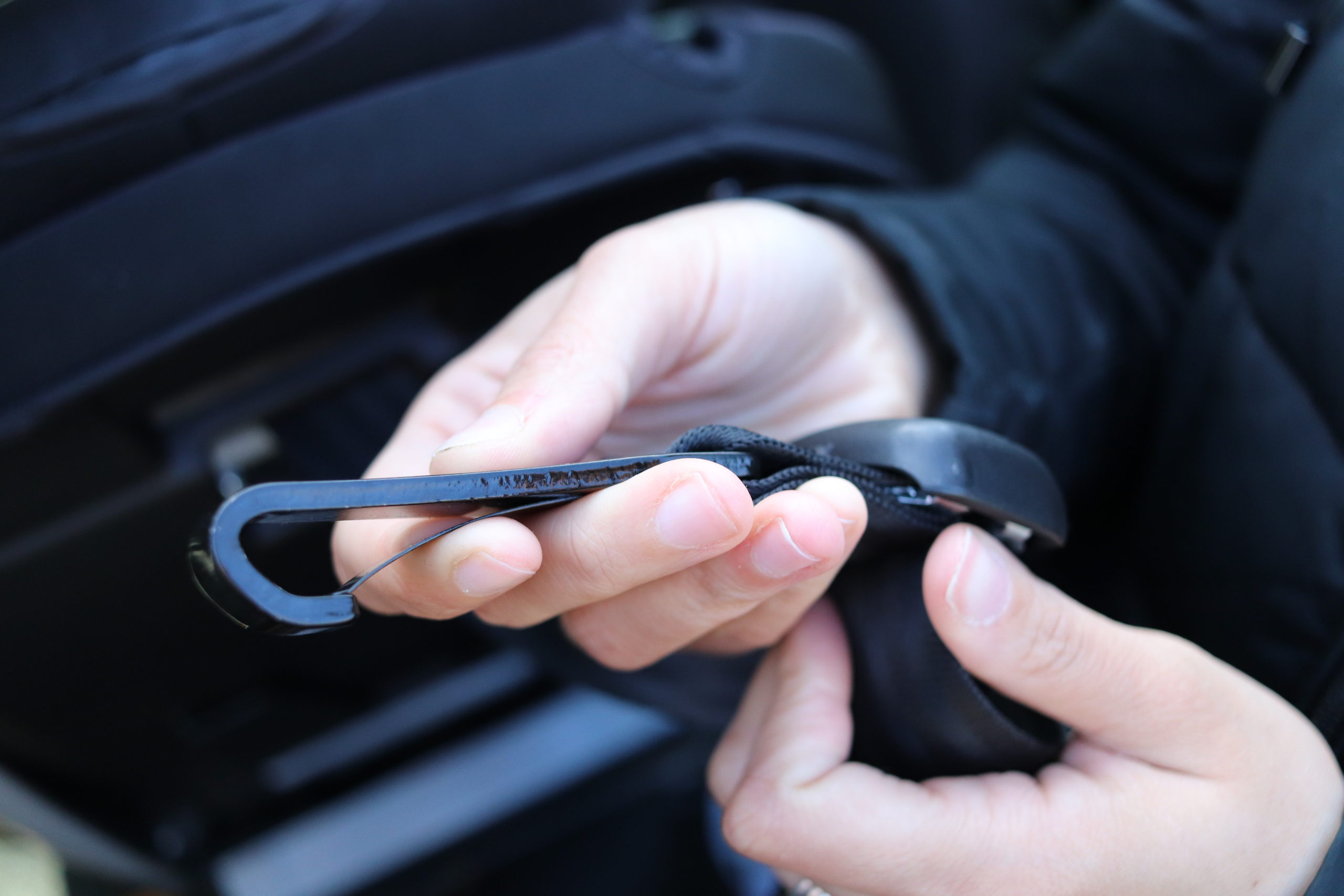 The strap that you see here is for attaching the car seat when forward-facing. You hook it to the hook behind the headrest in the back seat of your car. It is pretty hard to attach and tighten in most cars…pretty annoying, honestly.