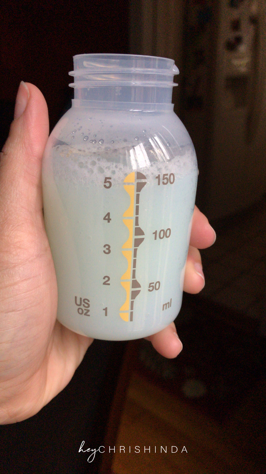 So, I’m pumping and it’s blue … it is thinner and has less fat than with your regular cream colored milk… I pumped 5 whole ounces of this blue tinted milk, which yes, it is absolutely okay for your baby to drink. If you didn’t pump and they just drank directly from your boob, you would never even know it was blue.