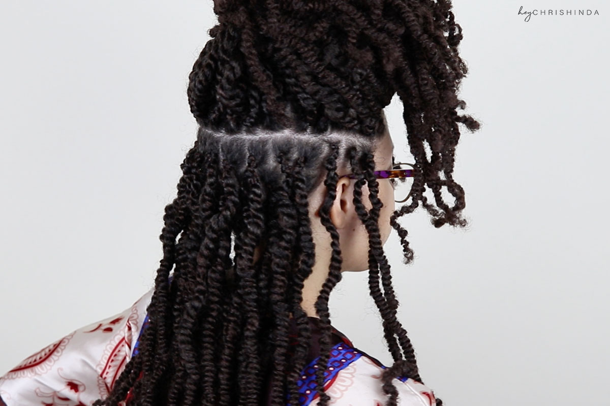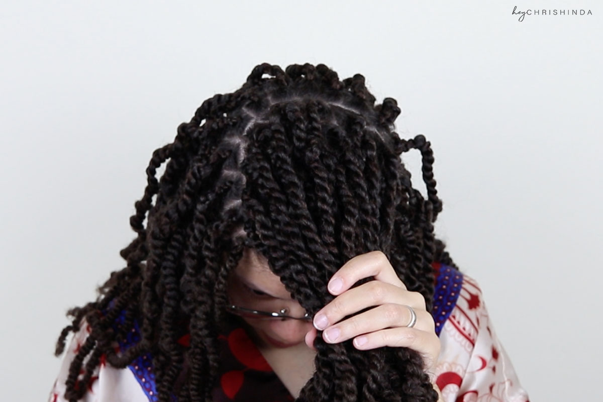 *Tip* If you want really long spring twists, you can make the hair like a candy cane, where one side is short and the other is really long. What you would do it start off with a braid, split the third section so that there are only two sections, start twisting, and before you get to the end of the shorter side, you want to blend that with the longer side, splitting that as well. I got this tip from Ria Stuart’s video . Start around 3:45